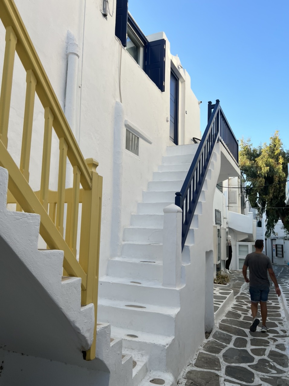 Điểm đặc trưng của nơi này là cầu thang lên tầng hai của căn nhà đều nằm trước cửa. Ngay cầu thang, chủ cửa hiệu treo các sản phẩm chào bán cho du khách. Ở Mykonos cũng như nhiều đảo khác trong cụm đảo Cycladic, gió rất lớn vì thế, những cối xay gió được xây dựng bởi người Venetians (người Venice, Ý) từ thế kỷ 15 -16 vẫn còn tồn tại. Nhiều cối xay gió đã đóng cửa và chỉ còn 16 - 28 cái còn hoạt động ở Mykonos. Từ trên đỉnh đồi, du khách có thể quan sát được cả khu phố cũ nhộn nhịp ngày nay.