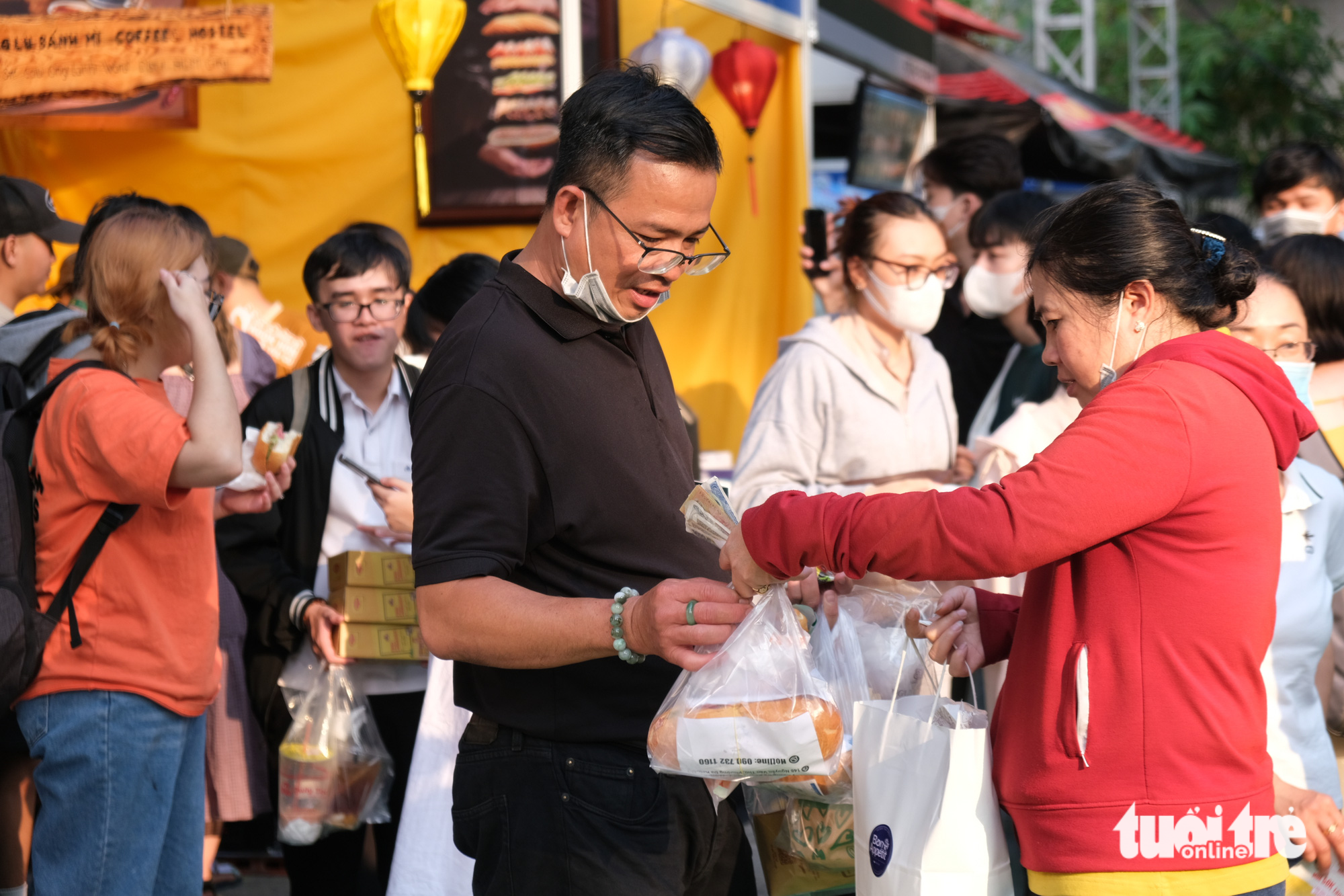 Nhóm bạn của Anh Tú (quận 7, TP.HCM, thứ 2 từ phải qua) thích thú thưởng thức bánh mìLễ hội bánh mì Việt Nam lần thứ nhất năm 2023 diễn ra từ ngày 30-3 đến ngày 2-4 với 120 gian hàng do Hiệp hội Du lịch TP.HCM, Sở Du lịch TP.HCM tổ chức.