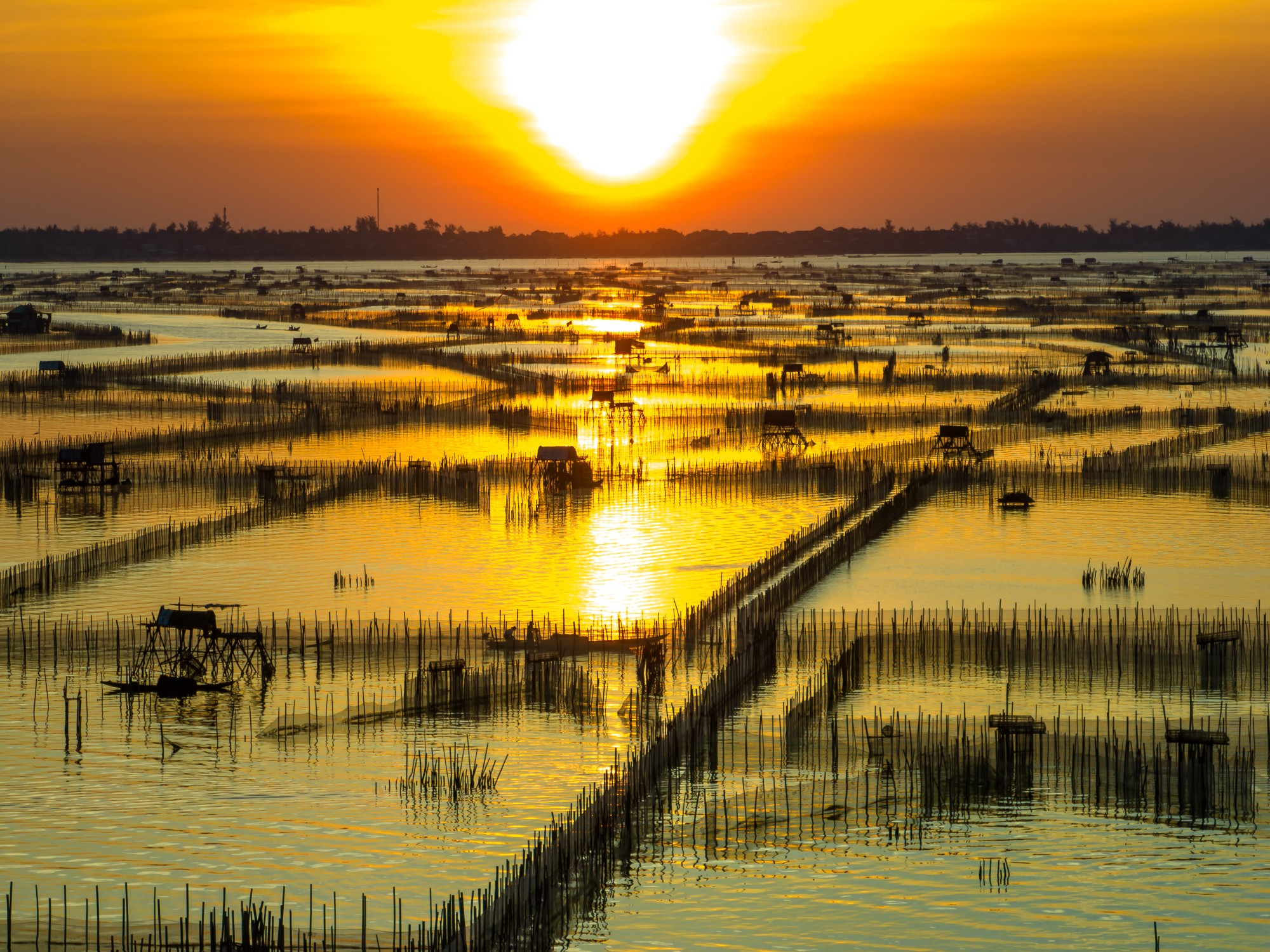 Thời điểm đẹp nhất trong ngày để khám phá khu đầm này đó là sáng sớm, cảnh bình minh rất thơ mộng, độc đáo, khá khác so với các đầm nước khác bởi hệ thống chắn sáo và những căn nhà chồ - Ảnh: HACHI