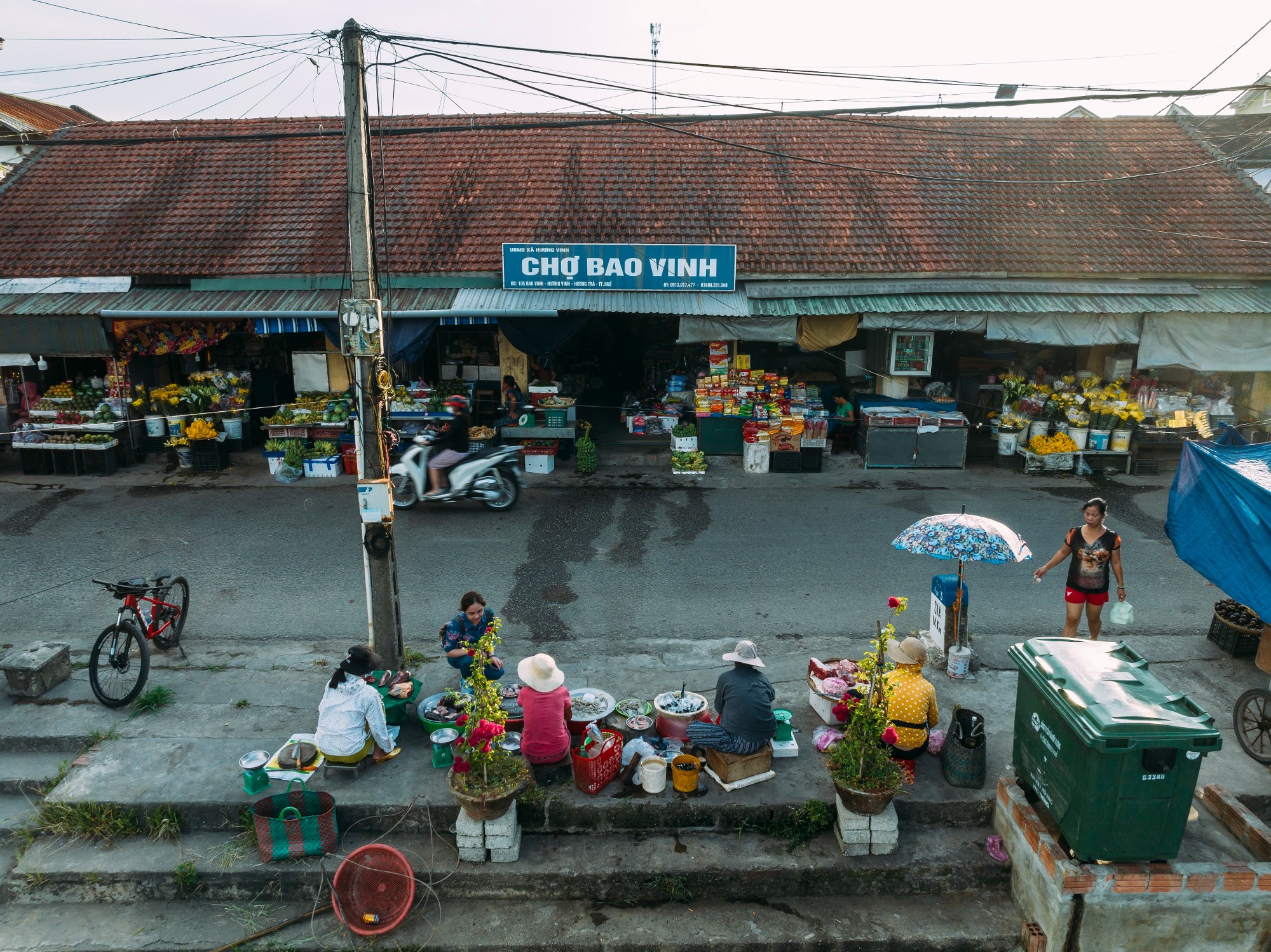 Dù ngày nay sắc màu đô thị hóa đã bao phủ muôn nơi, Bao Vinh vẫn giữ được nét riêng. Điểm nhấn của con phố này là những ngôi nhà cổ, mái ngói nằm sát nhau nhuốm màu rêu phong, là bến đò ngang sang các làng bên kia sông, là ngôi đình làng và khu chợ mặt hướng ra sông - Ảnh: HACHI
